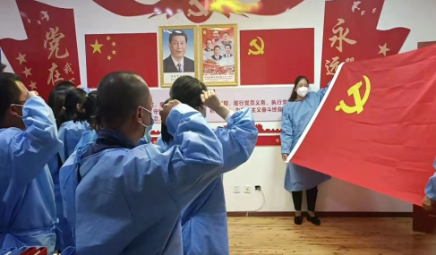 中共西藏林芝嘉龙房产联合支部委员会西嘉龙发(2022)06号简报临时党支部筑起疫情防控红色堡垒我宣誓,我志愿加入中国共产党,……8月23日晚,铿锵有力的誓言在嘉龙联合党支部党建室回荡。根据上级要求和当前疫情防控形势,我公司和三包单位及小区党员成立临时党支部,党员志愿者高举右手庄严宣誓,共同为抗击疫情构筑红色堡垒。图为:嘉龙花园临时党支部党员重温入党誓词连日来,志愿者们有